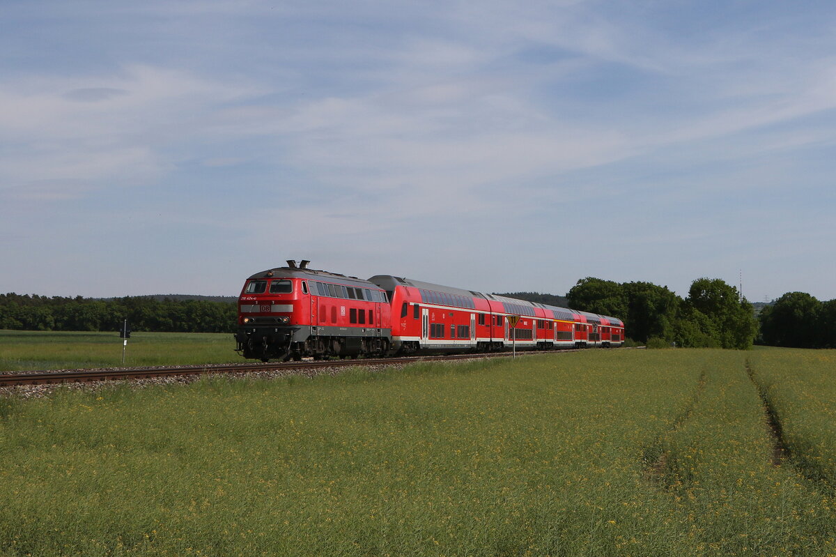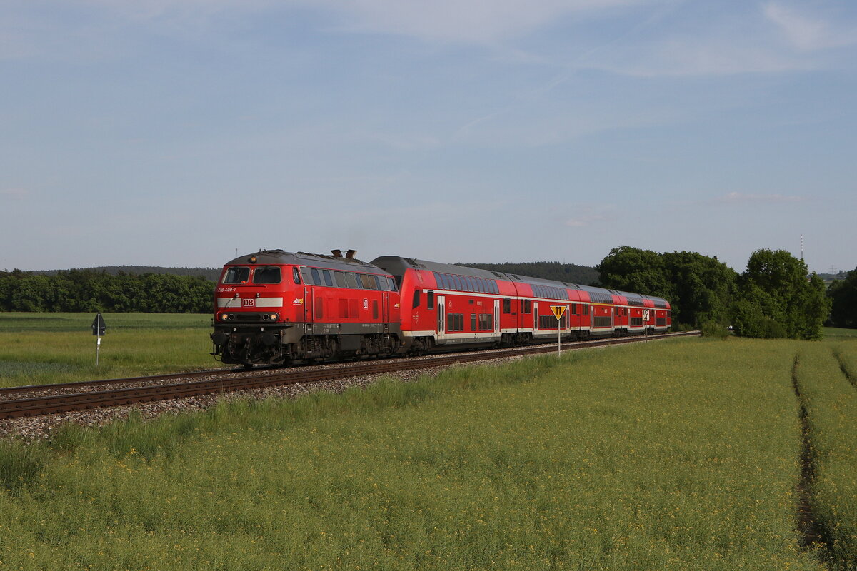 218 460 "Conny" mit dem "IC Nebelhorn" aus Augsburg kommend am 21. November 2021 bei Riedles im Allgäu.