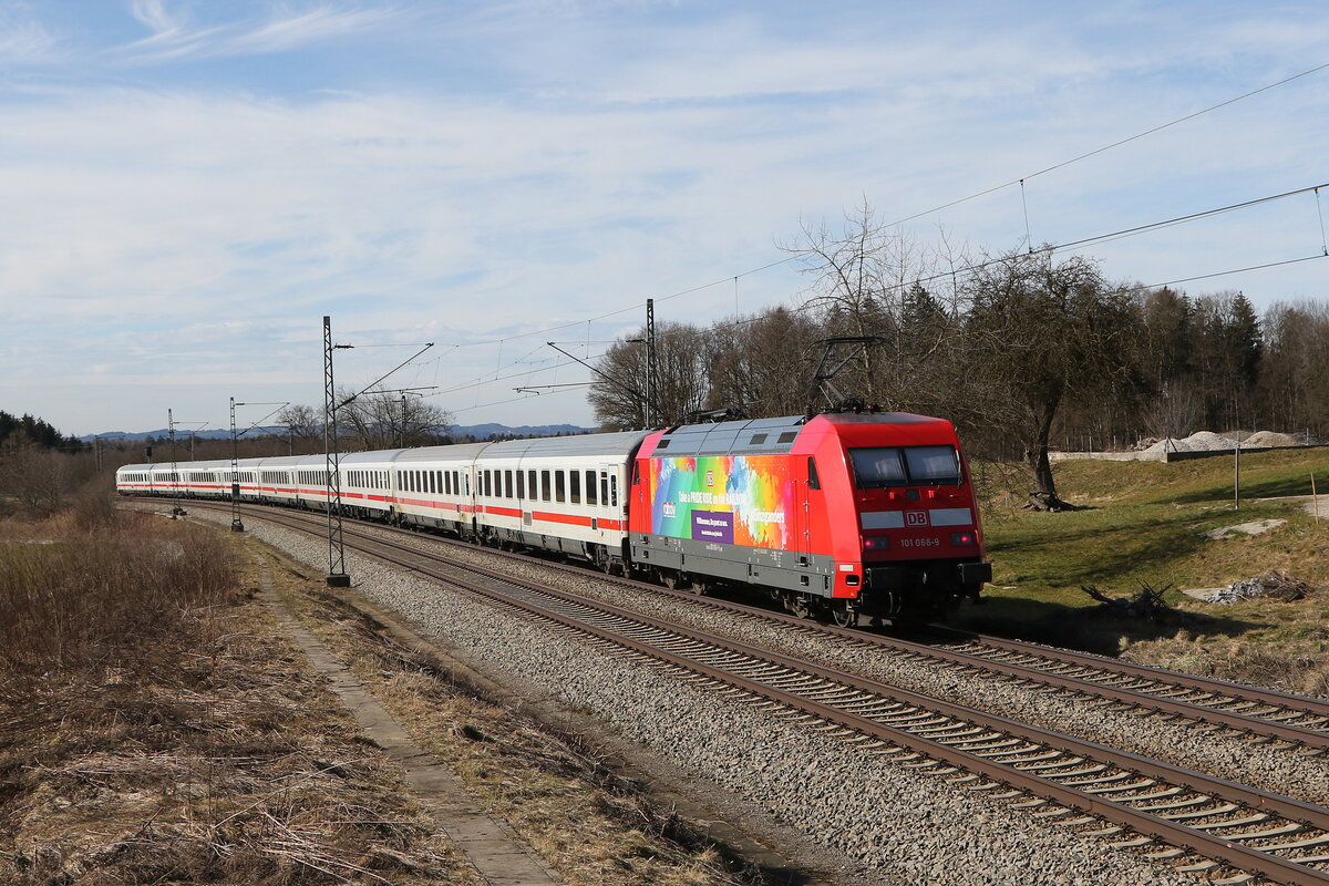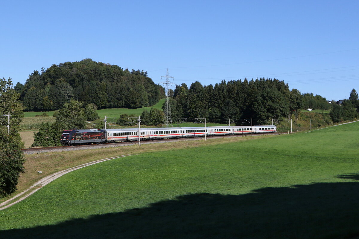 101 005 "DEVK" mit dem "IC Königssee" aus Würzburg kommend am 6. August 202 in Gemünden.