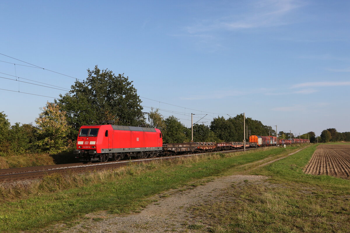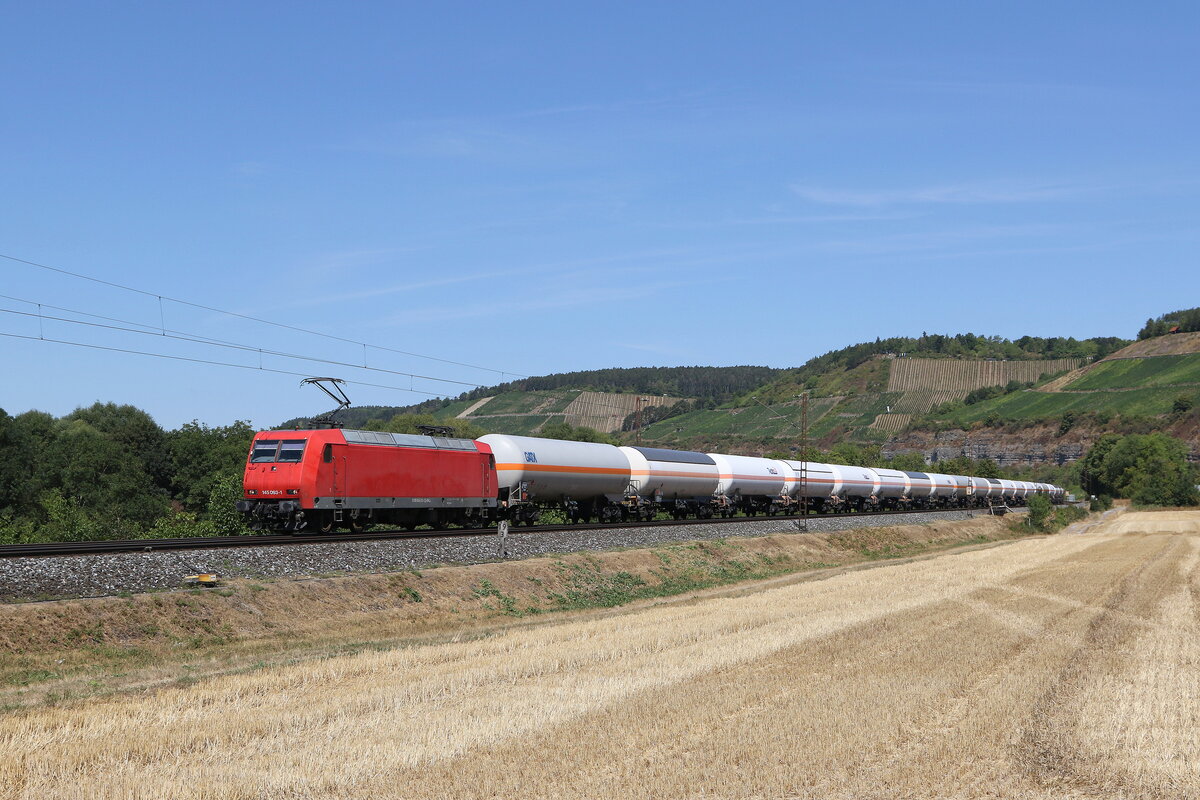 145 030-7 durchfährt am 11. August 2017 mit einem leeren Autozug den Bahnhof von Nienburg.