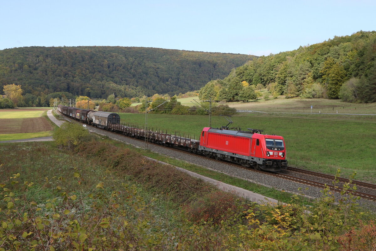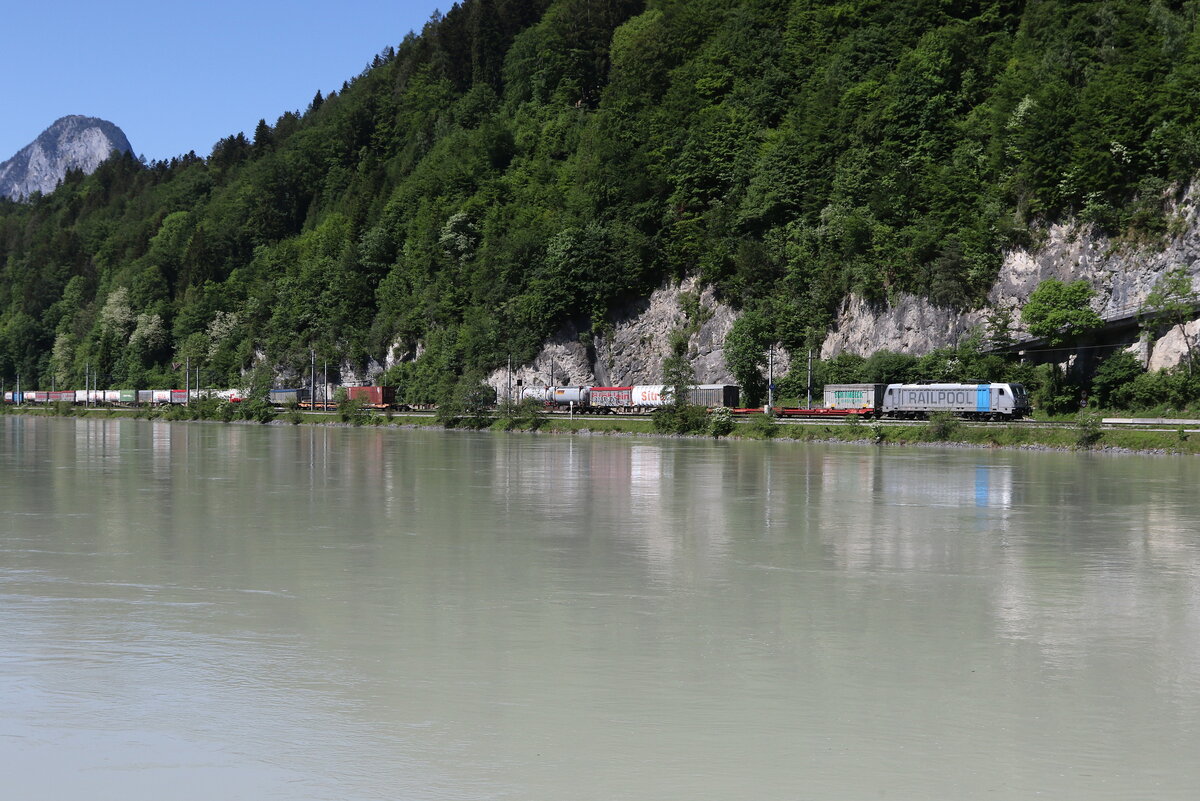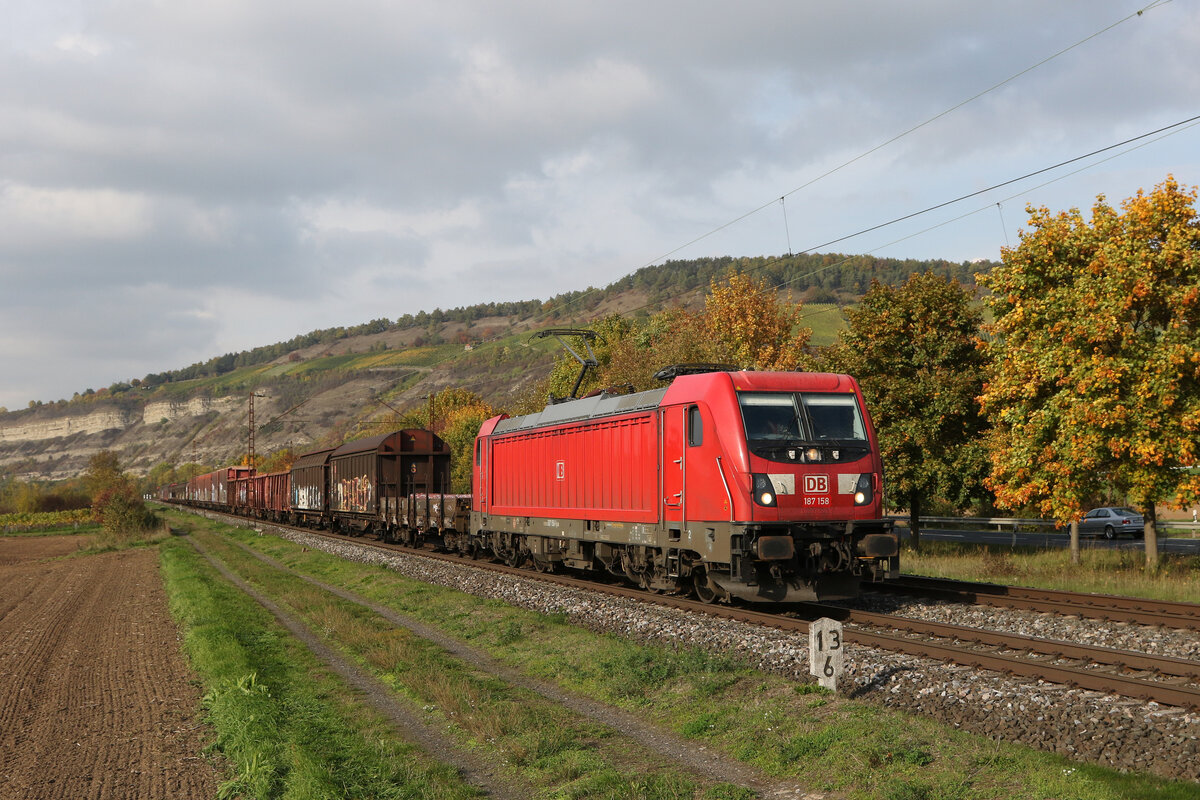 187 080 mit einem Containerzug am 23. Juli 2021 bei Himmelstadt am Main.