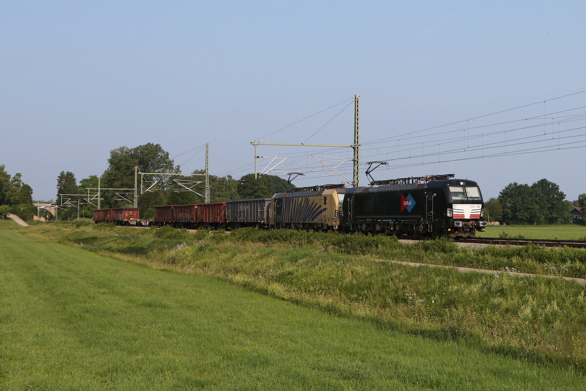 189 914 mit einem gemischten Güterzug aus München kommend am 19. August 2025 bei Vachendorf im Chiemgau.