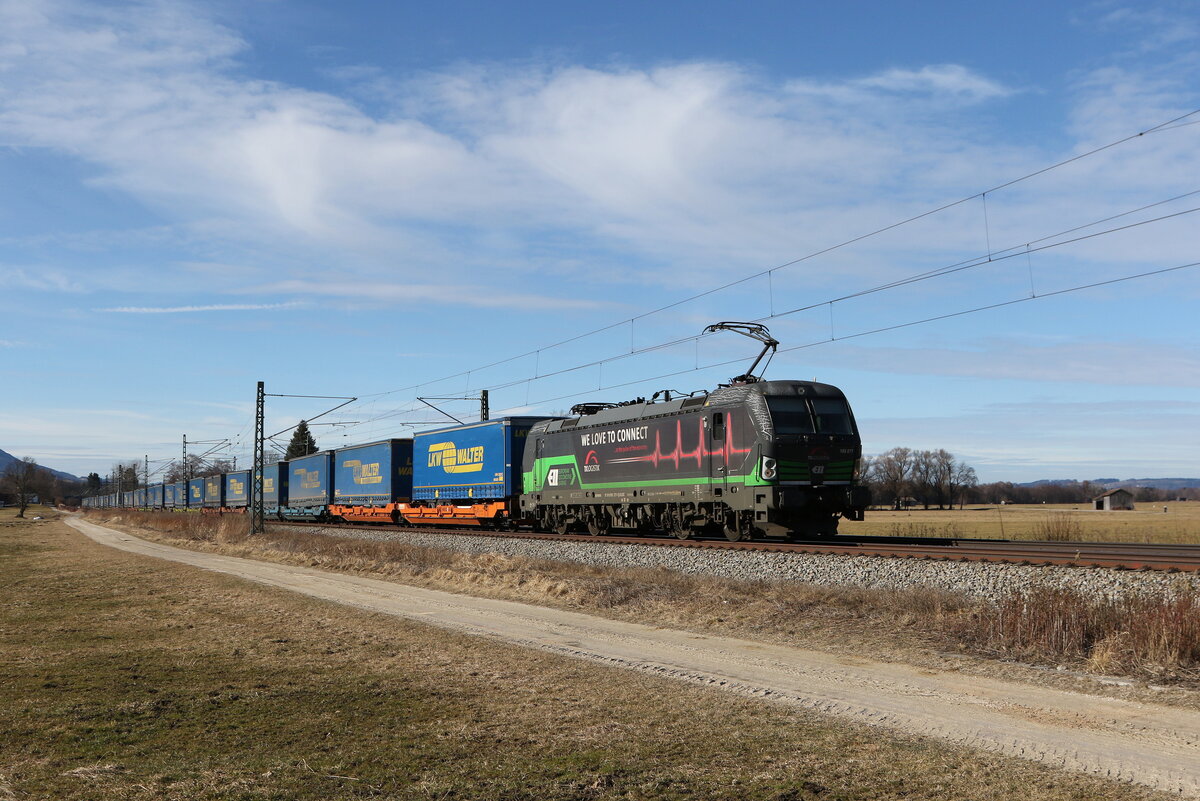 193 710 und 193 709 waren mit dem "WALTER-KLV" am 12. Februar 2023 bei Hütt im Chiemgau in Richtung München unterwegs.