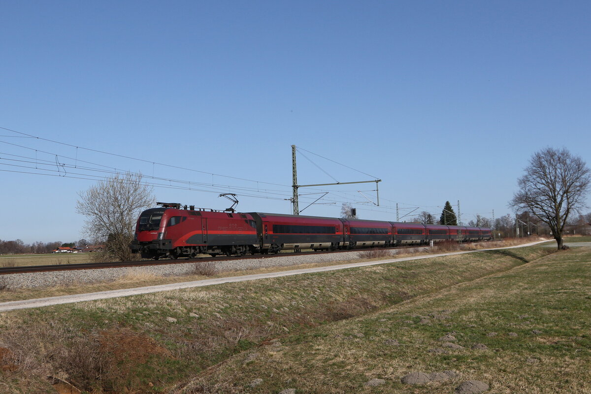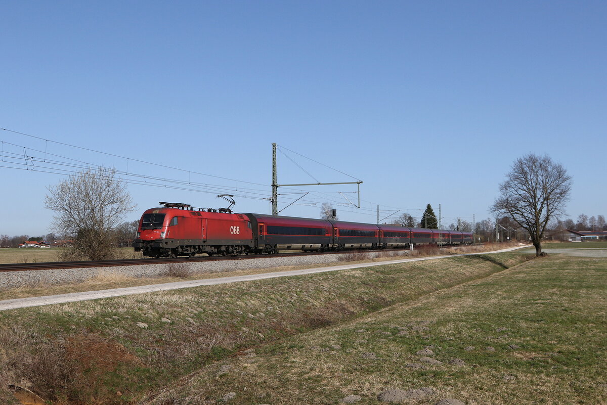 1116 199 "Nächster Halt: Job mit Sinn" mit einem "EC" aus Salzburg kommend. Aufgenommen am 19. Juli 2025 bei Vachendorf im Chiemgau.