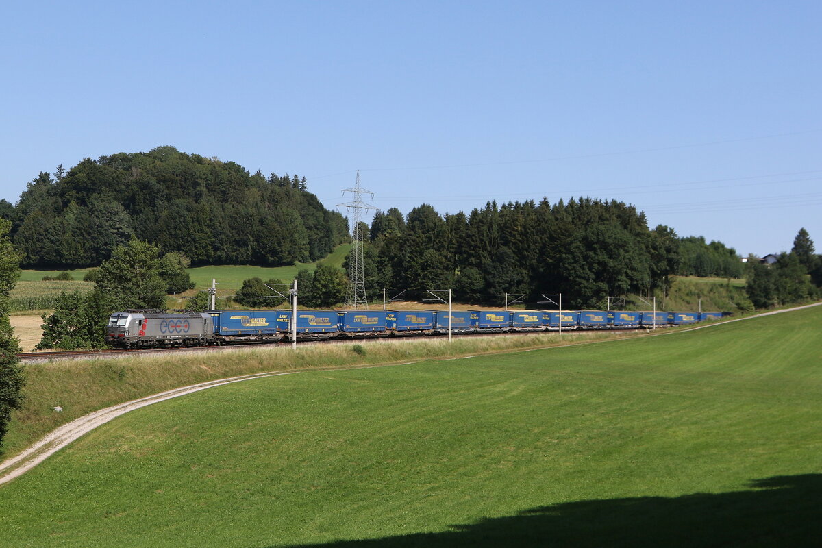 193 211 mit einem Getreidezug aus Salzburg kommend am 9. April 2017 bei Bernau am Chiemsee.