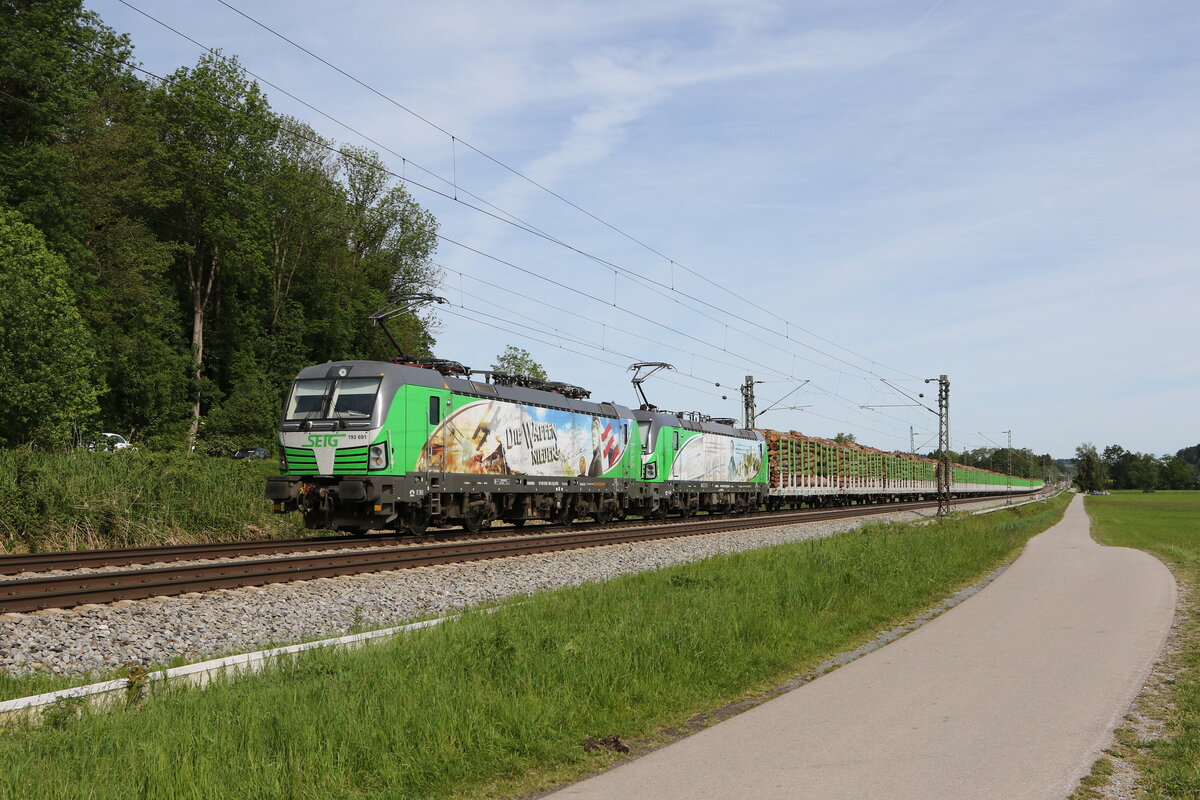 193 892 und V 100.51 von "SETG" mit einem leeren Holzzug aus Salzburg kommend am 9. Oktober 2024 bei Hufschlag.