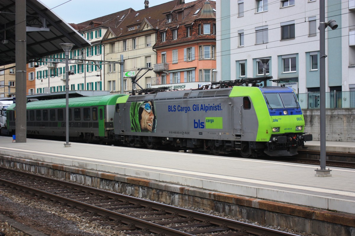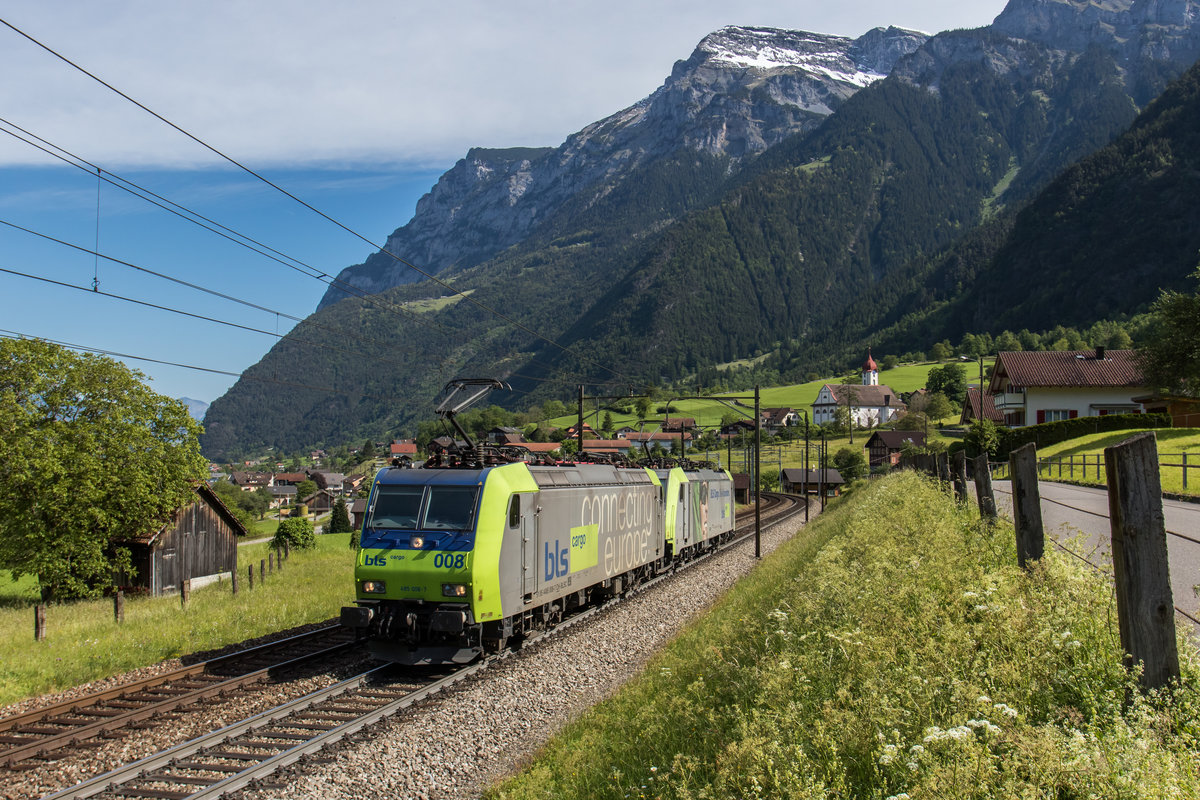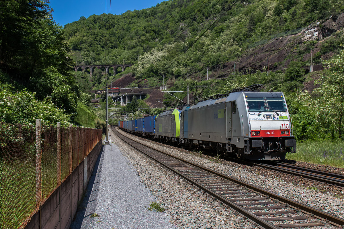 486 5120 und 485 xxx waren mit einem Containerzug am 26. Mai 2016 bei Gurtnellen in Richtung Erstfeld unterwegs.
